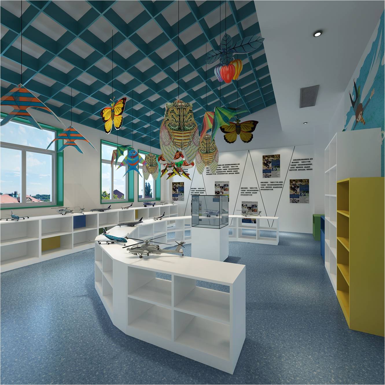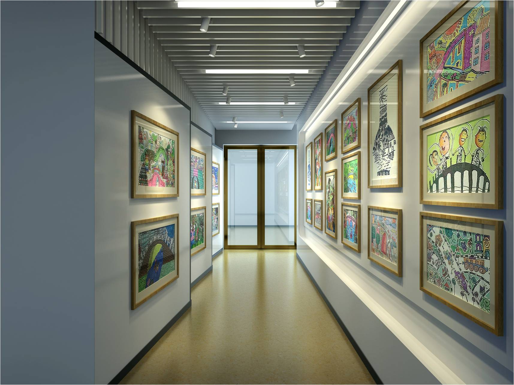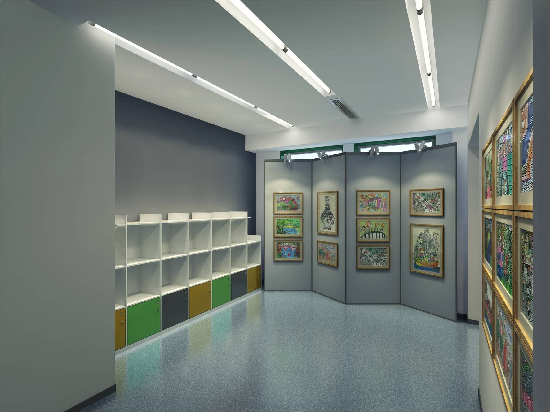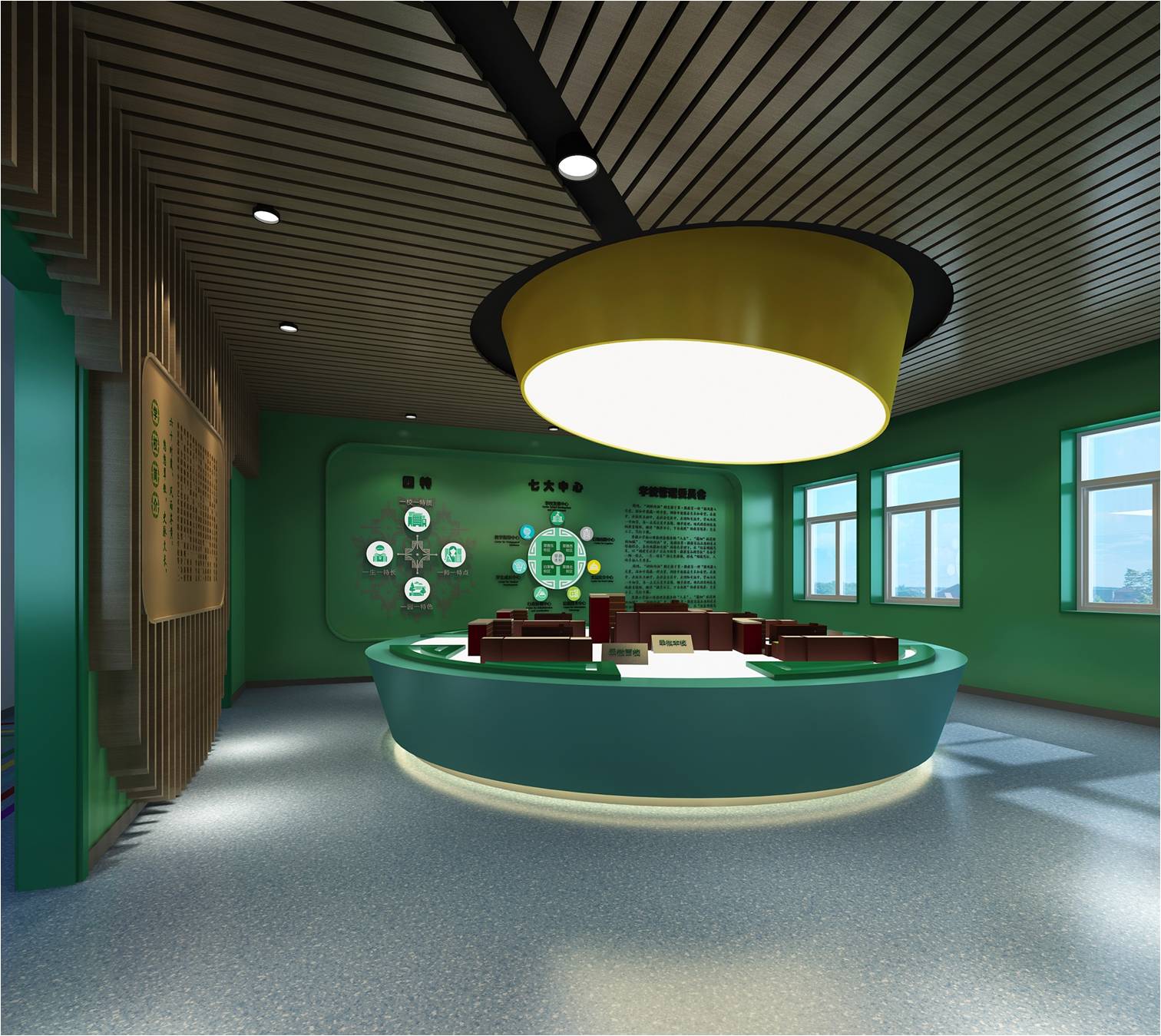 入口結(jié)合學(xué)校輔助圖形綠色墻面與翠微賦的結(jié)合及辦學(xué)特色的墻面設(shè)計(jì)直接將參觀者置于濃濃的文化氛圍中展示了教育的品牌特色。地面不同顏色的色帶將空間功能分布簡單明了的說明給參觀人員。