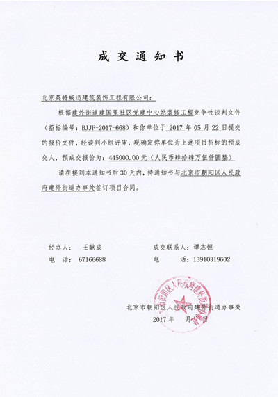 根據(jù)建外街道建國里社區(qū)黨建中心站裝修工程競爭性談判文件(招標(biāo)編號(hào):BJJF—2017—668)和英特威迅于2017年5月22日提交的報(bào)價(jià)文件,經(jīng)談判小組評審,現(xiàn)確定英特威迅為上述項(xiàng)目招標(biāo)的預(yù)成交人,預(yù)成交報(bào)價(jià)為445000.00元(人民幣肆十肆萬伍千圓整)。