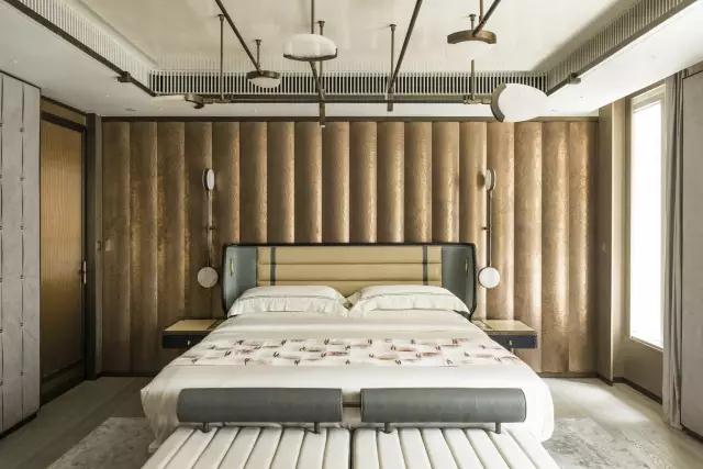主臥里有自己的休息區(qū)和獨(dú)立的步入式衣櫥。Joyce Wang的簽名在絨面革襯墊和手工地毯上十分顯眼。臥室背景墻墻面的青銅造型用古老的設(shè)計(jì)方式讓人眼前一亮。
