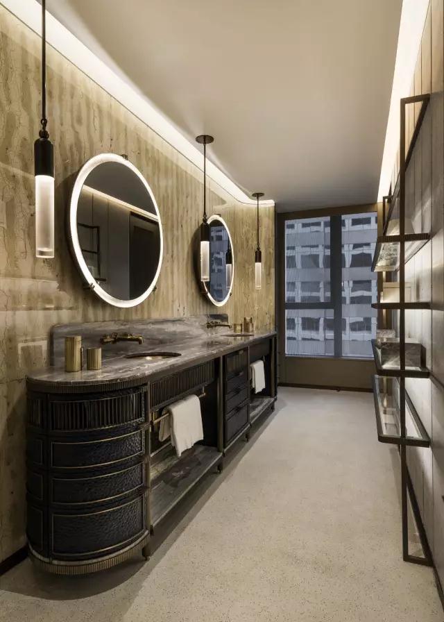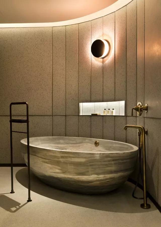 在寬敞的主臥浴室里,定制的奢侈品還在繼續(xù)。一個(gè)獨(dú)立的帕拉賽羅浴缸,由一塊大理石雕刻而成,還有一個(gè)定制的圓形壁燈。水磨石墻面用黃銅飾邊裝飾,周圍的墻壁也會(huì)給這間豪華的住所增添最后的色彩。