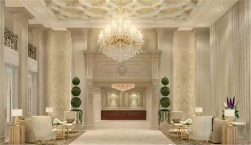 酒店的宴會(huì)廳同樣延續(xù)了奶白色與黃金色調(diào)的融合,彰顯宴會(huì)溫馨氛圍。