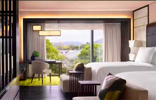 京都四季酒店共有110間客房,客房內(nèi)洋溢著寧靜私密的氛圍,設計上體現(xiàn)出傳統(tǒng)和室的特色。日光在簡譜的木地板上投下鮮明的影子,屏風上也繪著當?shù)厮囆g(shù)家的作品。還有以明亮的紫色為主調(diào),采用天然橡木地板的客房設計,盡顯皇室風范。多數(shù)房間可以擁有日本庭院的室外風景,陽光穿透樹枝從落地窗灑進房內(nèi),水光粼粼的庭院更一覽無遺。HBA新加坡設計團隊還巧妙地將池泉園、妙法寺及周邊的美景納入房間窗景中。透過窗戶便是一副四季如畫的風景線。