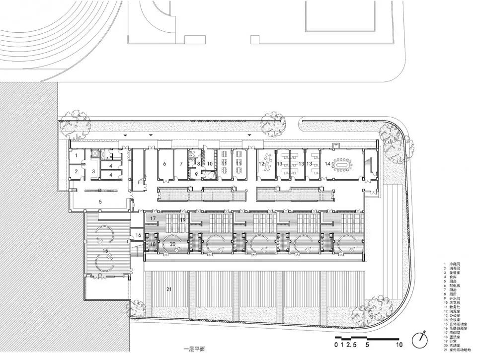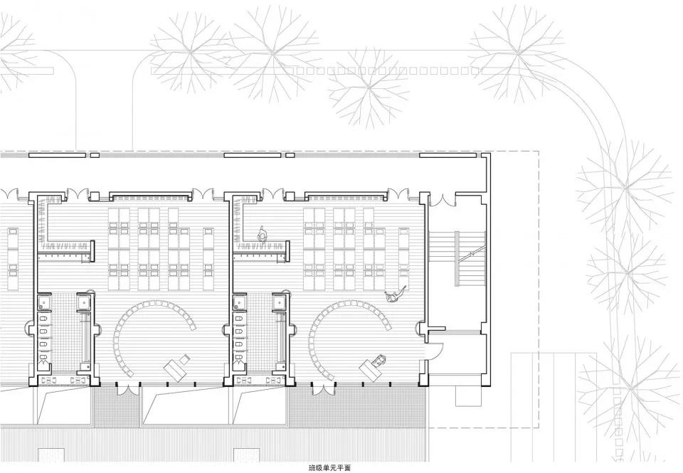 建筑中間的內(nèi)院使一層北側(cè)行政和服務(wù)空間也可得到足夠的采光。在景觀方面,每個班級都有對應(yīng)的綠地供幼兒活動。