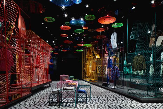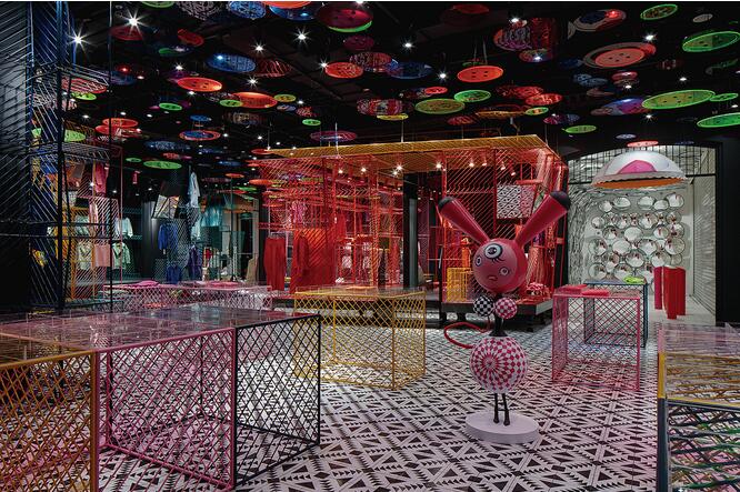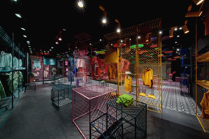 潮女區(qū)大色塊的撞色,由一根根鐵藝曲折而成的彩色貨架,在這個(gè)強(qiáng)調(diào)個(gè)性的空間,利用衣架的前后折度來(lái)分割成雙面掛衣的結(jié)構(gòu),彩色與折線的拼織來(lái)打造幻彩個(gè)性的空間已來(lái)呼應(yīng)該空間里服裝展現(xiàn)的個(gè)性。