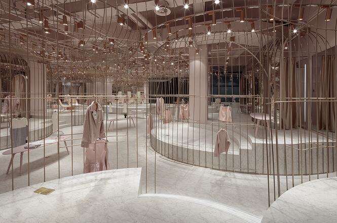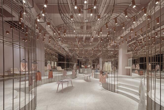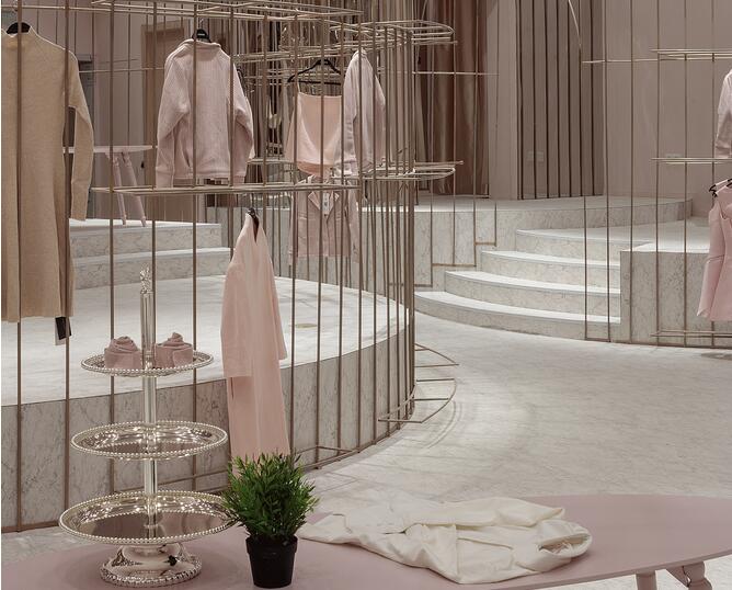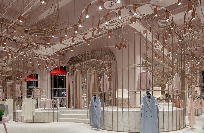 名媛區(qū),一個(gè)個(gè)精致的金絲籠,衣架被放在金絲籠內(nèi)外兩側(cè),遠(yuǎn)看仿若被精心呵護(hù)的公主蓬蓬裙。高低起伏的弧形平臺(tái),增加趣味性的同時(shí)又不失活潑可愛(ài)。試衣間被巧妙的隱藏在弧形鏡面的“蓬蓬裙”內(nèi)側(cè)。同時(shí)每個(gè)試衣間區(qū)域也提供梳妝、休憩、自拍區(qū),等待著每一位公主。