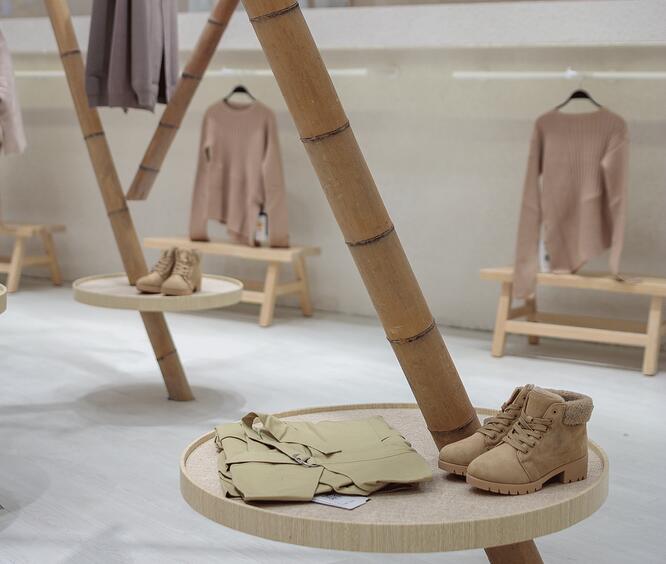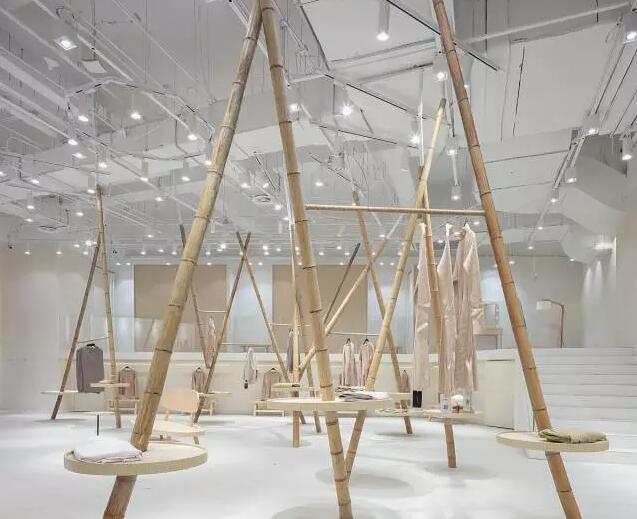 通過(guò)主入口區(qū)大大的門拱,進(jìn)入到森女區(qū)。乳白色肌理墻面,白色地面,一個(gè)潔白干凈的空間,支立著一根根竹竿并以麻繩做連接,而衣架也就此成型。穿衣鏡則隱藏在兩根竹竿的夾角立面上??臻g明亮簡(jiǎn)潔并用古樸的材料來(lái)呼應(yīng)該空間衣服類型的氣質(zhì)。