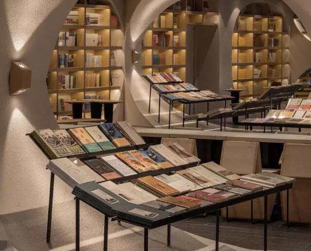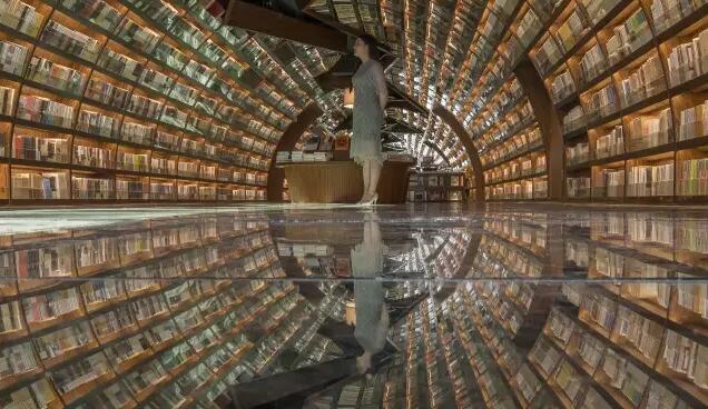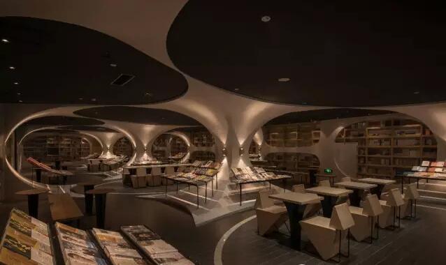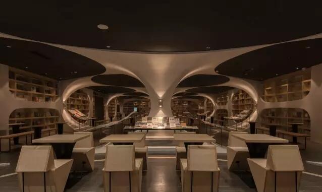 走入揚州鐘書閣的正門則是書店的前廳通廊,設(shè)計師利用揚州本地拱橋的概念,巧妙地延續(xù)了鐘書閣書天書地的視覺符號。在地面與天空中的河流鏗鏘前行中,引領(lǐng)著讀者沉入到浩瀚的知識海洋。兩廂的書架用優(yōu)美的弧線結(jié)構(gòu)拉伸成天際線的形狀,宛如溪流之上的橋梁,搭建著人與書籍之間的那座心靈橋梁。進(jìn)而前行至右側(cè)則是更加廣闊的書籍之地,拱橋及河流的關(guān)系給了設(shè)計師無窮的靈感,于是得到此處的上下鏡像的空間關(guān)系。設(shè)計師還利用各種拱形來連接各個區(qū)域,每一位讀者進(jìn)入這個空間,就能充分感受到這空間帶來的震撼。鏡像、拱形加上柔和的燈光,這一切所帶來的迷離感,會讓讀者不由自主地想起橋下的波光粼粼,悄然靜思中達(dá)到心情的平和,并享受讀書的快樂。由各種波起伏連接而成的空間,保留了足夠的尺度,以便留給給讀書分享會的讀者分享的場地。