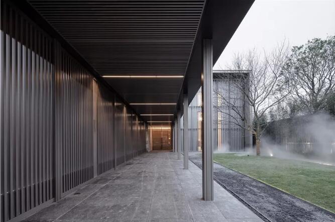 此次改造的重點(diǎn),一是入口,二是內(nèi)部平面功能的重新設(shè)定。樸悅希望整個(gè)銷售中心的改造能與外界形成一種反差,以不同的場(chǎng)景營造形成有趣的體驗(yàn)。整個(gè)售樓處鬧中取靜,幽靜的內(nèi)院獨(dú)享一片城市的寧靜?;谶@個(gè)優(yōu)勢(shì),設(shè)計(jì)師將原正面入口移至左側(cè),并在內(nèi)庭改建了一處廊道,以序列感排列的木格柵構(gòu)建,溫暖靜謐、平靜中帶來舒緩的節(jié)奏,以此形成步入的初始印象。