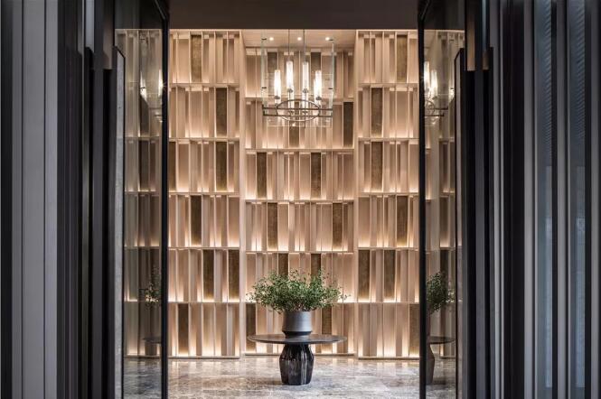 推門進(jìn)入,首先步入眼簾的是前廳。淺木色木質(zhì)格柵自上而下充斥整個(gè)8米層高空間,建筑元素織就的前廳展現(xiàn)了自然的親切和溫暖,加之兩側(cè)與頂燈的渲染,與外部形成了視覺上的差異,令人震撼。肅然進(jìn)入,行至位于對(duì)立面凹檻處的接待臺(tái),半遮掩狀態(tài)的圓形導(dǎo)臺(tái)被裹挾式藏以身后,僅以灰色墻紙和深色大理石裝飾,藏而不露更添幾分神秘。