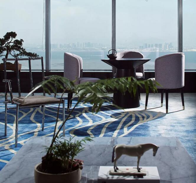 男賓VIP區(qū)可享受廈門(mén)當(dāng)?shù)氐钠凡柚?。定制地毯呈?xiě)意黑灰色線條,與屋頂燈飾遙相呼應(yīng),形成體系。