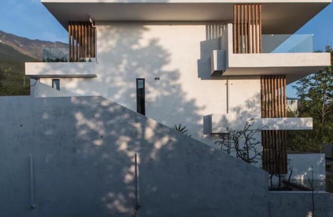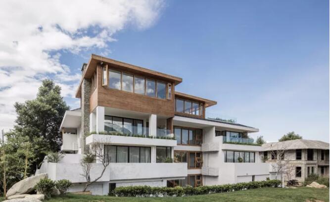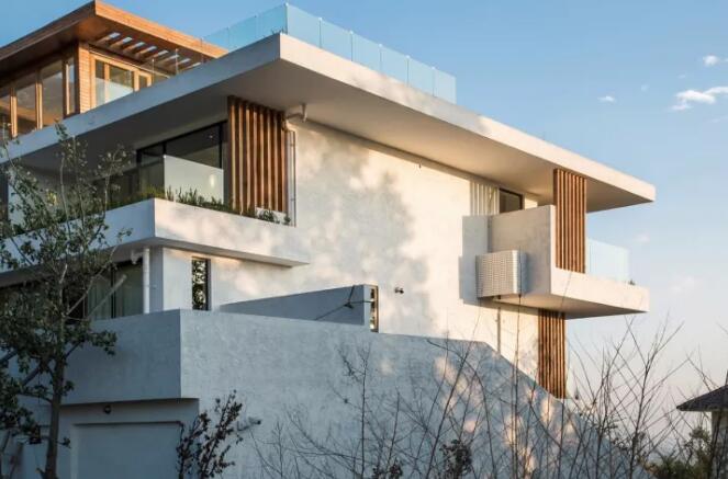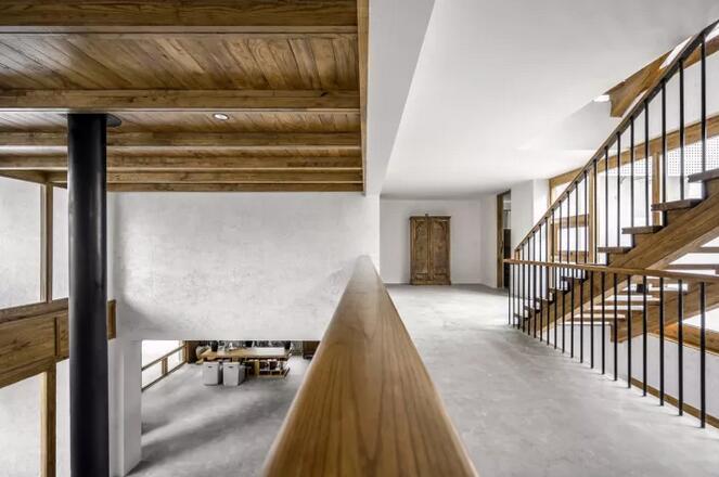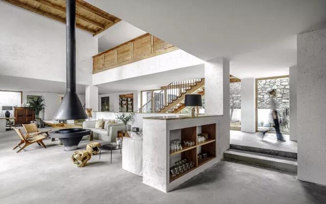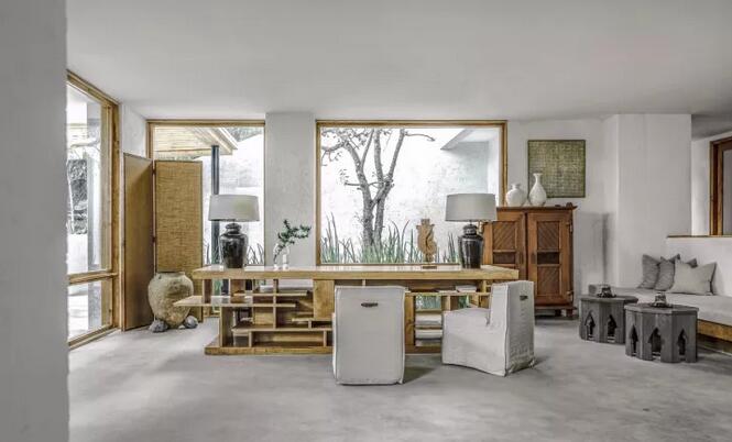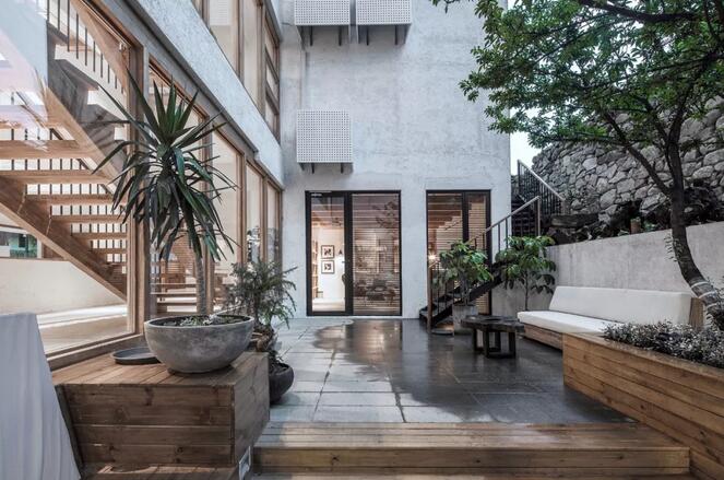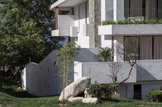拾山房在材料的運用上也秉持著低調的特點。主體是略帶粗糲的清水混凝土,配以木格柵和木質的窗框,頂層則是以木為主,與自然更為相融。首層院落則有山石堆砌的圍墻,從坡地里長出。整體用色也非??酥?,在這山水之中絲毫不顯突兀。