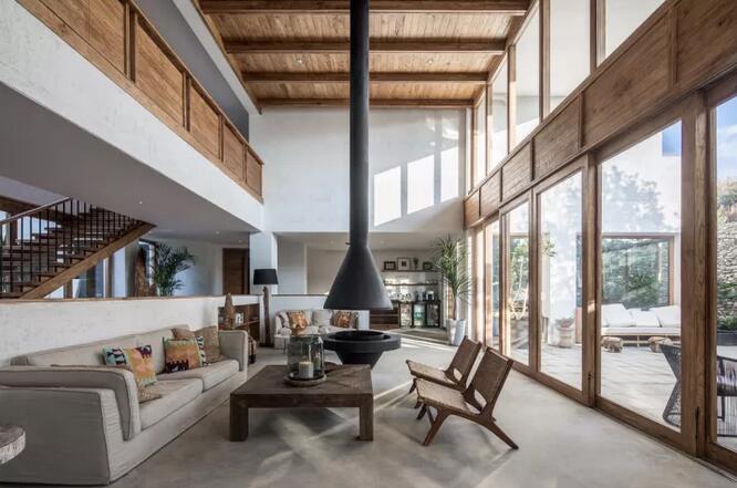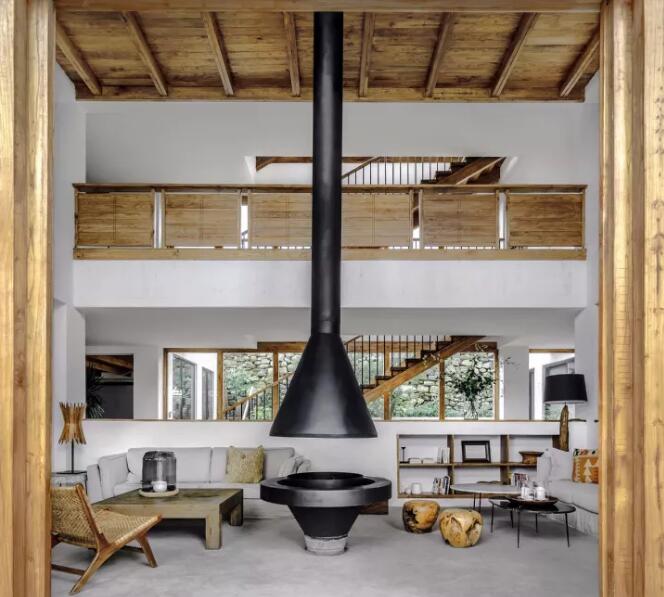 入口位于建筑東北角,并不十分起眼,由路面下幾個臺階,正對著的是側院里的鏡面水池,池中植一棵高大有年份的花紅果樹。拐過入口門廊,進入接待廳,以一種較為婉轉的方式開始空間體驗。承接入口空間的是位于中心的大廳,兩層通高,形成整個首層的核心空間。巨大的上懸式壁爐掛在大廳的中心,強化了空間的核心感,其他的公共空間皆圍繞其展開。