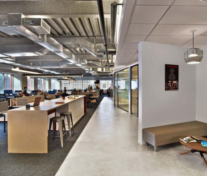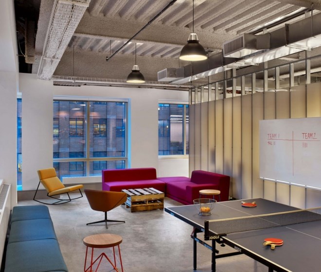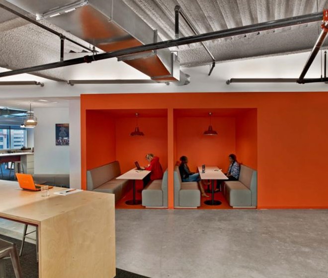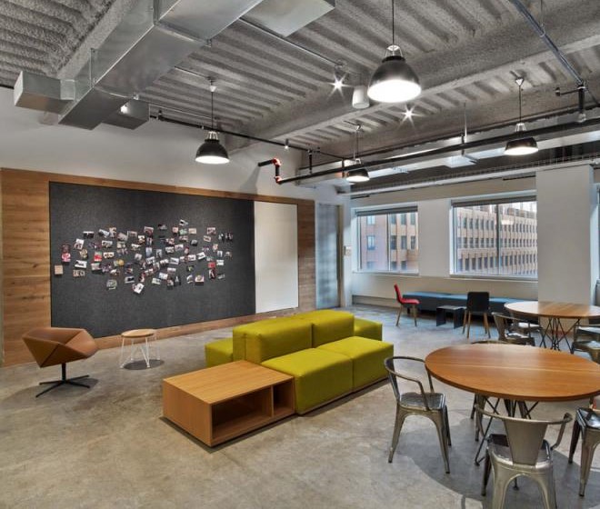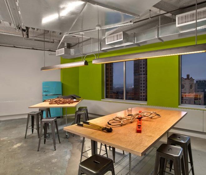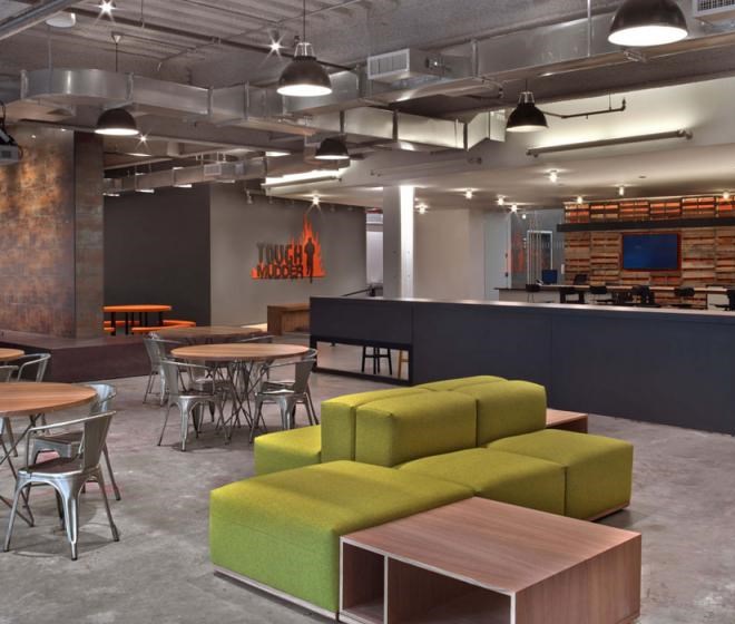 客戶進(jìn)入辦公室應(yīng)該可以通過辦公室的顏色、形狀和工作氛圍來描述出該公司是做什么的,并且怎么做的。Tough Mudder的總部就是這樣的設(shè)計(jì)作品,該辦公室是由M Moser Associates完成的。