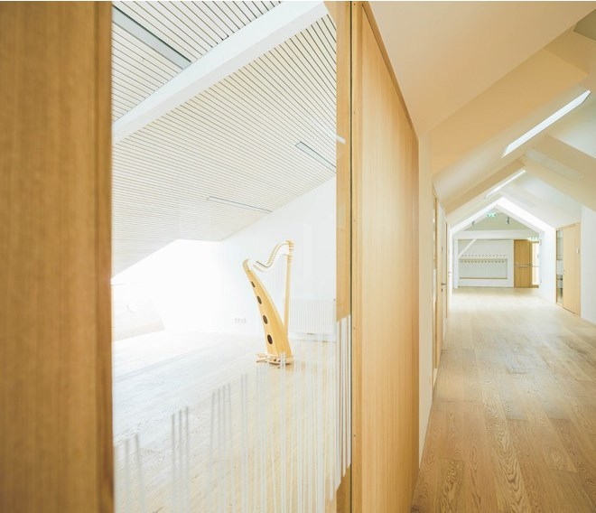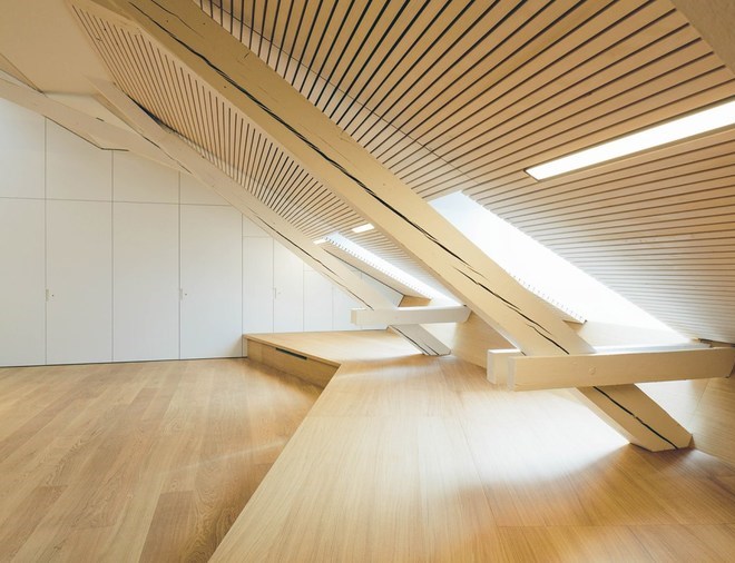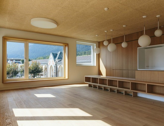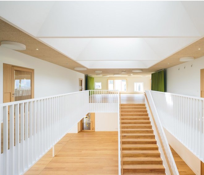 幼兒園的核心是其交通空間,寬敞的樓梯被一個(gè)畫廊環(huán)繞,雨傘狀的錐形天窗提供了人工和自然光。