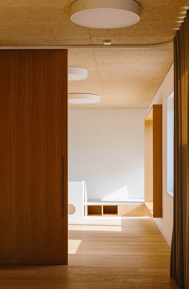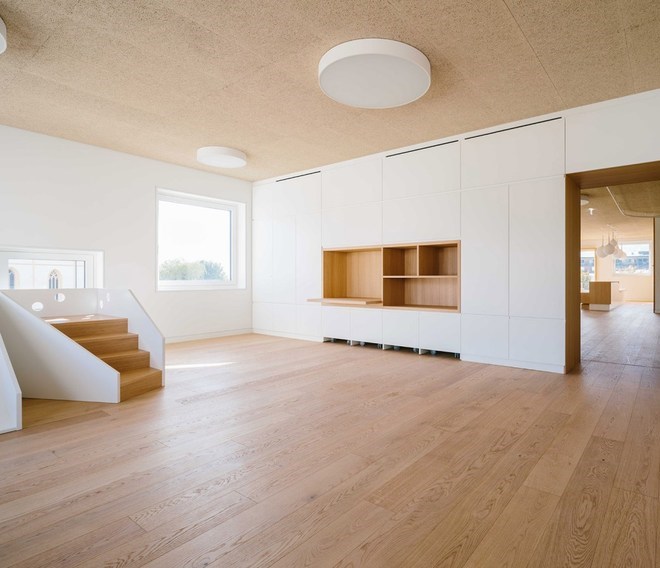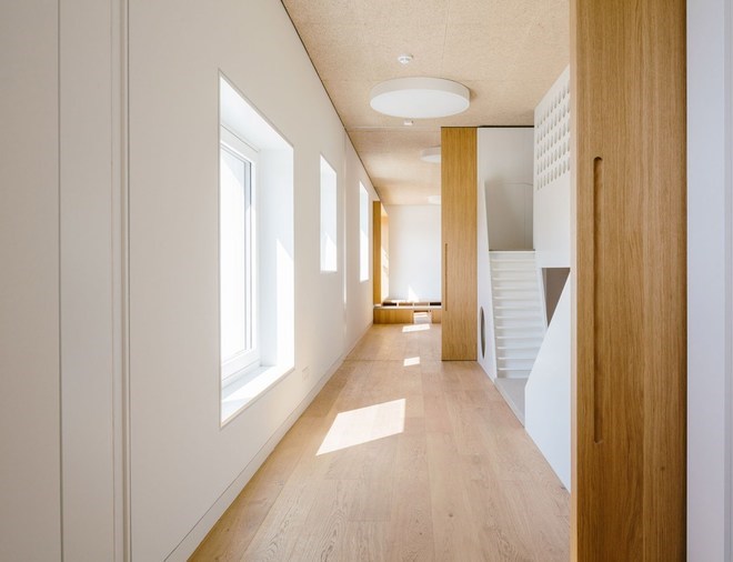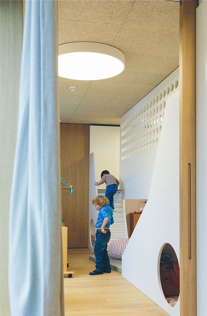 樓梯直接通往公共用餐區(qū),它與八組兒童房間相連組成了一個(gè)巨大的共享空間。孩子在這里學(xué)習(xí)娛樂(lè),所有空間都均質(zhì)排布。建筑師設(shè)計(jì)了大量的被動(dòng)式節(jié)能屋。