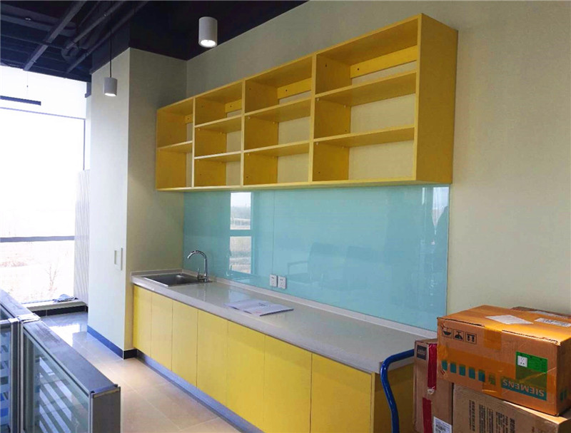 施工材料:氟碳漆、磁力板(便于磁力扣吸附公司宣傳資料)、烤漆板、現(xiàn)代LED吊燈、釉面防滑地磚。