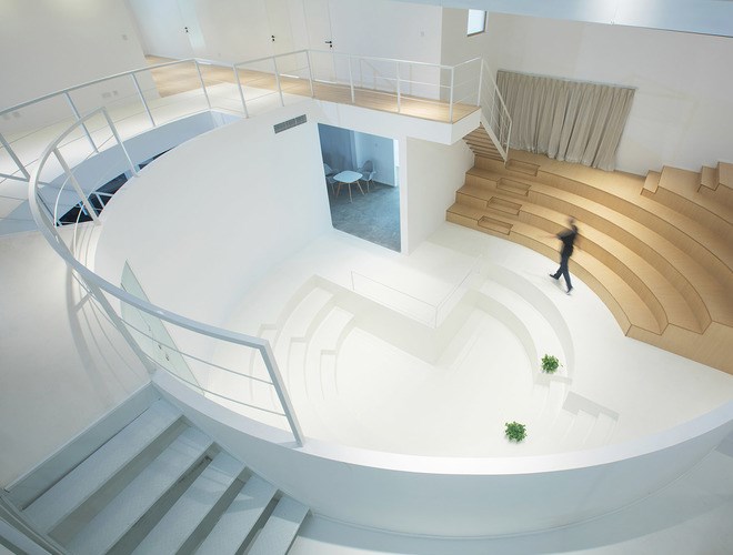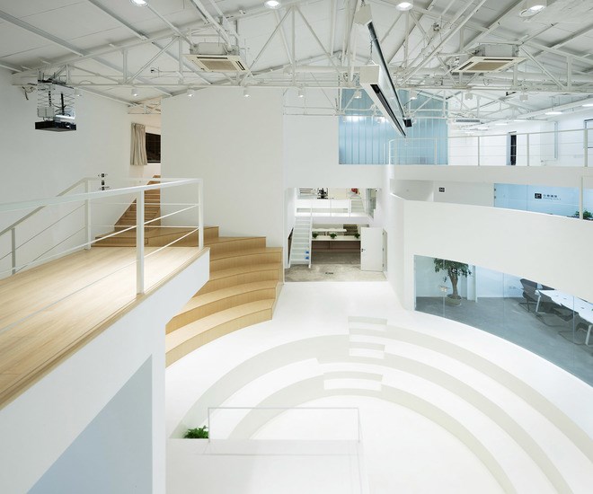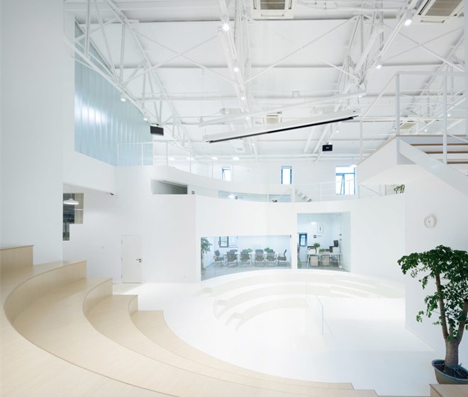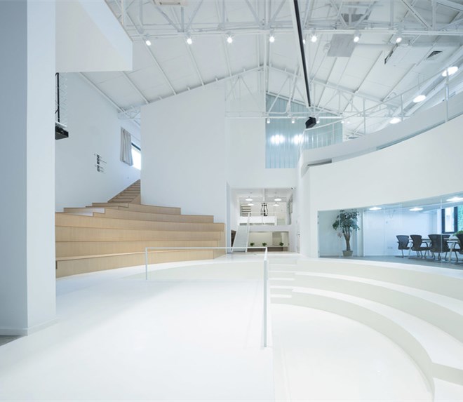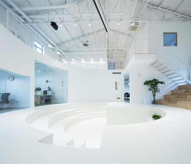 中庭的圓形廣場(chǎng)靈感來(lái)源于電影里經(jīng)典場(chǎng)景土樓的空間特質(zhì),保留原始層高的通高空間作為整個(gè)設(shè)計(jì)核心交流場(chǎng)所,從空間設(shè)計(jì)上塑造一種強(qiáng)烈的集體歸屬感。廣場(chǎng)的四分之三部分作圓形下沉,成為街角式的階梯小劇院,以及提供討論,看電影等一系列公共交往功能。廣場(chǎng)周圍圍繞一圈工作區(qū),包括封閉、半開(kāi)放辦公室,以及創(chuàng)始人的辦公空間。