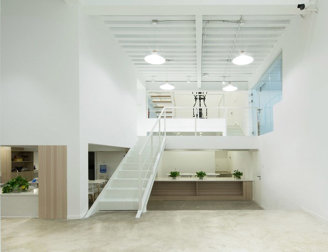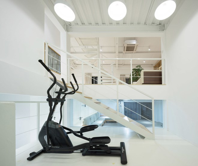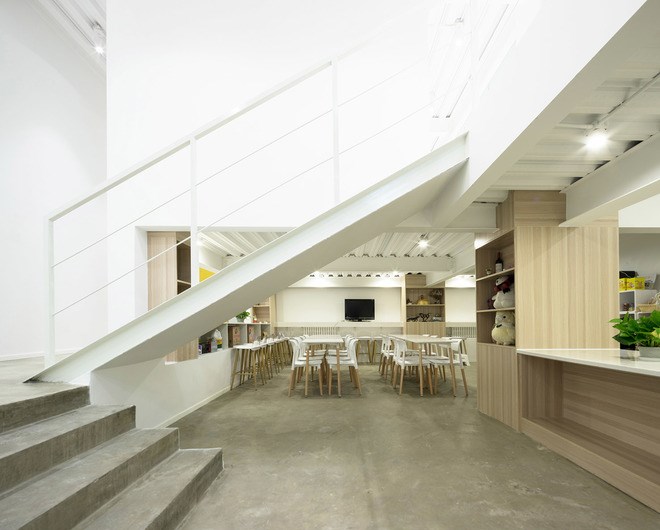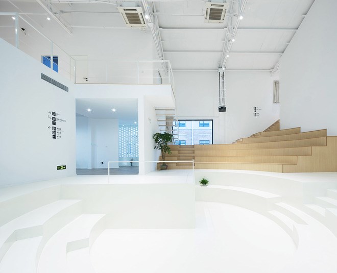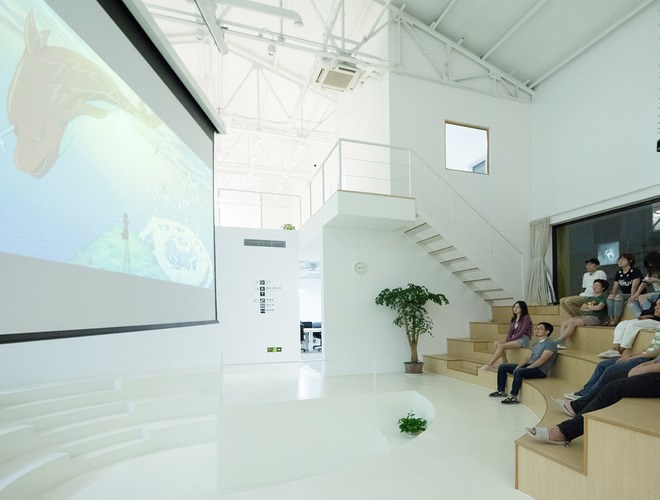 整個(gè)設(shè)計(jì)在保留長(zhǎng)方形廠房的基礎(chǔ)上,建筑室內(nèi)空間輪廓放棄了長(zhǎng)方形的限制,建筑室內(nèi)標(biāo)高也不再是單一水平,而是功能的分化設(shè)置不同區(qū)域的標(biāo)高,通過(guò)室內(nèi)階梯與坡道相互連接。廠房東邊做了兩層標(biāo)高,一層入口區(qū)為形象宣傳,臨近南立面是一個(gè)長(zhǎng)廊,一半作為電影海報(bào)展示,另外一半為微縮景觀。外墻鏤空花磚形式,陽(yáng)光透過(guò)外墻照射到展示長(zhǎng)廊。二層為獨(dú)立創(chuàng)作空間與兩個(gè)創(chuàng)始人工作室。廠房西邊利用層高做了多個(gè)標(biāo)高,從一至四層以及之間的夾層與錯(cuò)層空間,容納了開(kāi)敞通透的圖書(shū)室,封閉的觀影室,健身房、淋浴室、半地下(負(fù)一米)廚房、聚餐和party空間,也有加班可以休息的睡眠空間。