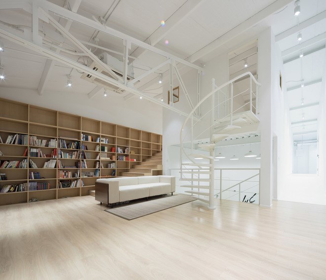 整個(gè)廠房建筑層高利用達(dá)到極致,并且外立面開(kāi)窗和室內(nèi)功能相互對(duì)應(yīng)。整個(gè)立面的開(kāi)窗對(duì)應(yīng)室內(nèi)不同的標(biāo)高空間,將建筑內(nèi)部的活動(dòng)與功能映射到建筑外表之上,晚上從墻外看到的是室內(nèi)是帶有場(chǎng)景化的節(jié)奏感。整個(gè)空間節(jié)奏張弛有度,從極其開(kāi)敞的中庭空間到極其有圍合感的影音室,再到半開(kāi)敞的圖書(shū)閱讀空間,在這個(gè)新的建筑里電影人既能通過(guò)各種路徑到達(dá)屬于所有人的集體空間,又能尋找到屬于自己的獨(dú)立小天地,讓工作室變成一個(gè)具有場(chǎng)景敘事感的空間舞臺(tái)。
