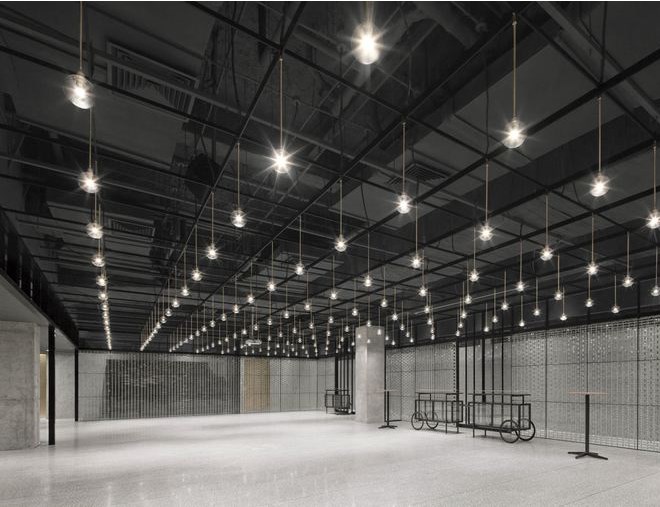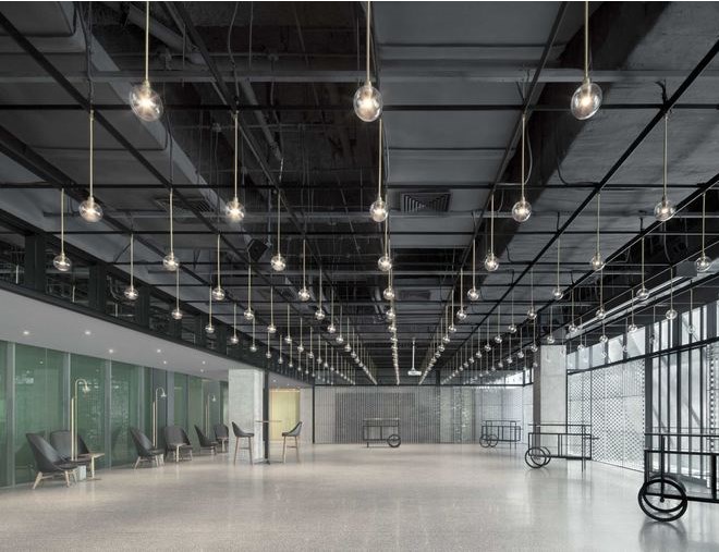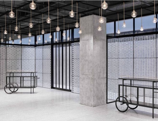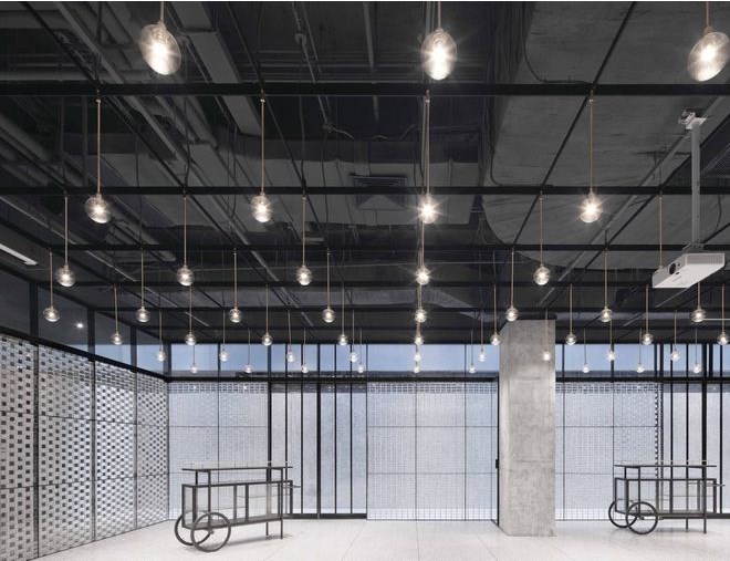室內(nèi)擺放了定制的家具,例如以街邊攤販的推車為靈感而特別設(shè)計(jì)的移動(dòng)式餐車。定制的燈泡以矩陣形式懸掛排列,呈現(xiàn)出簡單而優(yōu)雅的照明效果,同時(shí)也靈活適用與不同場合對空間的使用需求。