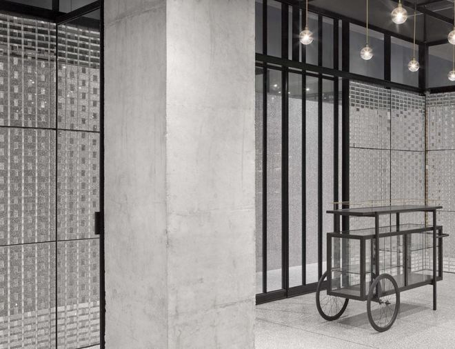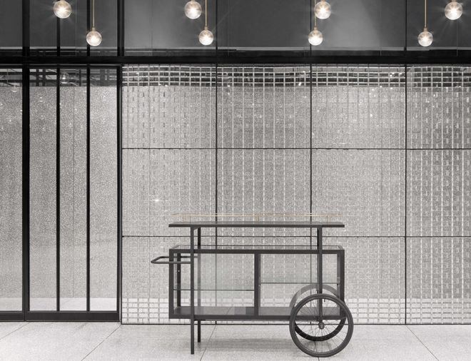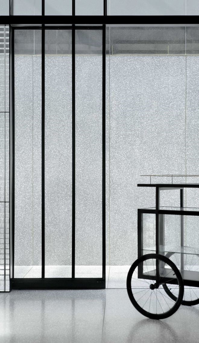 從北京隨處可見的灰色磚砌建筑中汲取靈感,玻璃盒子外殼由壓鑄玻璃磚按照傳統(tǒng)方法搭建制成。精心拼接后形成垂直的墻面系統(tǒng)。透明的墻面最大程度地將自然光引入空間內(nèi)部,帶來明亮而模糊的視野,從一定程度上保護(hù)了空間的私密性。