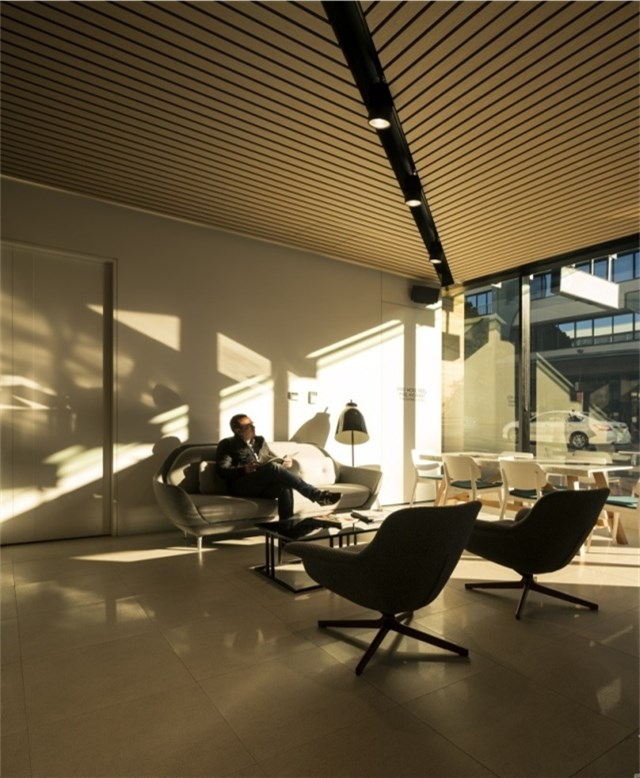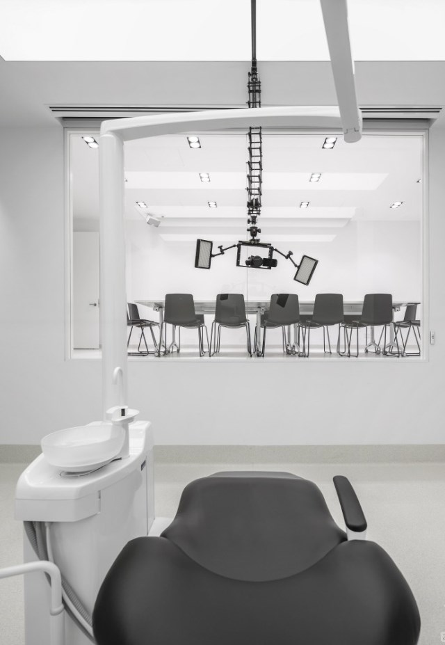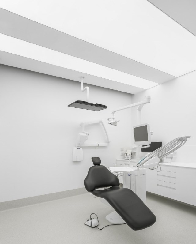 同時,不能讓室內(nèi)顯得局促,還不能擋住路人們的視線。為此,我們特意在兩個接待區(qū)之間設(shè)置了一個木制雕塑,作為二者之間的隔斷。在診所的另外一端,是進行高級口腔手術(shù)的手術(shù)室。