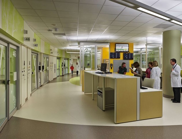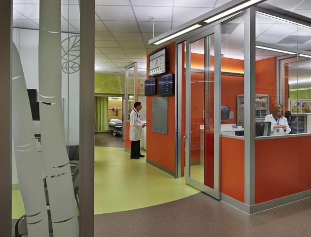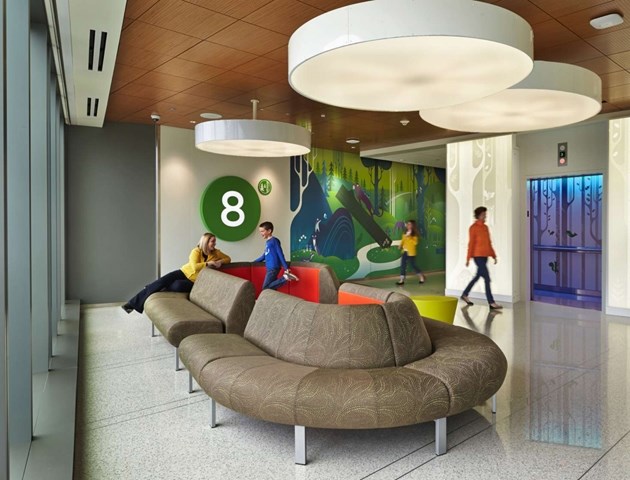 在這座大樓的設(shè)計(jì)理念中融入了自然和地區(qū)的概念,也給人提供了明確的方向,并且指明方向,能夠減少壓力。多層次的方式也應(yīng)用到音響設(shè)備上,對于提供一個(gè)有利于健康的環(huán)境十分重要。病人區(qū)的所有地板都是橡膠材質(zhì),能夠減少噪音?,F(xiàn)代的干凈線條以及多彩的顏色建造了一個(gè)品牌故事,只有在西雅圖兒童醫(yī)院才有。不過這些以融合藝術(shù)為特色的室內(nèi)設(shè)計(jì)對于21歲以下的病人十分有吸引力。有趣的圖案和藝術(shù)設(shè)計(jì)給空間帶來了愉悅的元素。