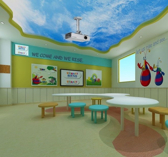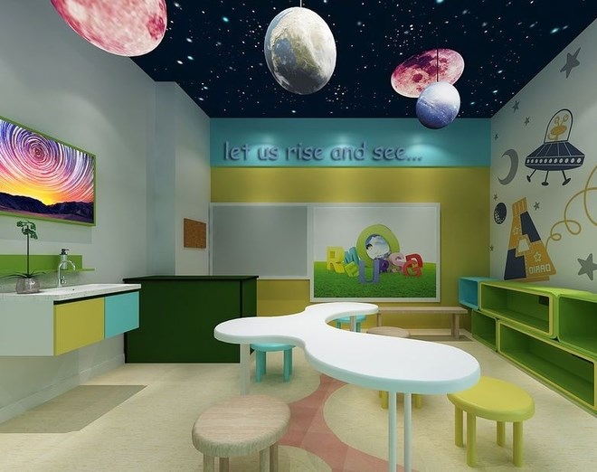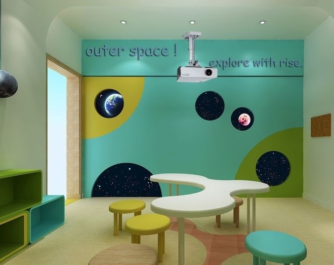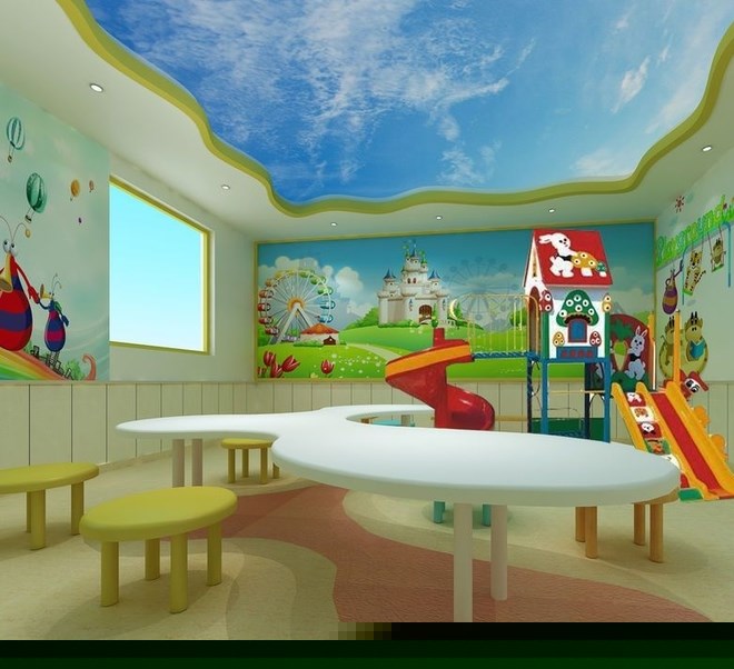 大多數(shù)孩子比較喜歡的顏色。該設(shè)計(jì)中心的區(qū)域區(qū)分明顯,有不同的裝飾風(fēng)格。有著模擬宇宙的神秘的房間,也有著貼近但自然可以看到藍(lán)天白云的房間。
