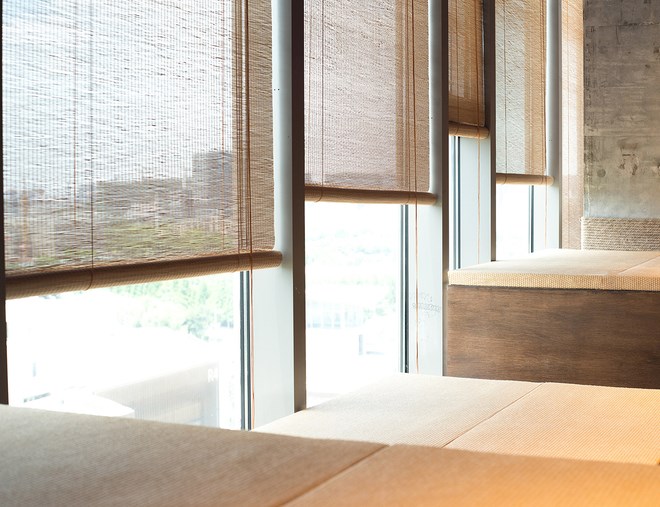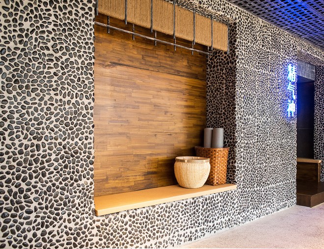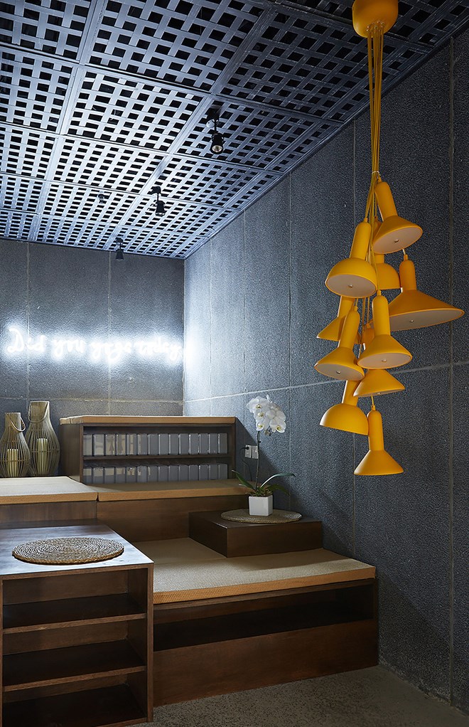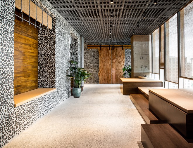 設(shè)計(jì)主要在于材料的運(yùn)用上。室內(nèi)的墻面以及地板都鋪上了鵝卵石、水磨石和水泥,仿佛漫步在城市中的街道,寧?kù)o平和。而這些原生材料和木制,竹子,編織物以及榻榻米這些柔和的材料在不經(jīng)意間趨向于一種平衡的狀態(tài)。