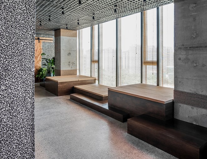 作為主體,不同的房間像是城市中聳立的建筑而公共區(qū)域的空間更像是城市中來(lái)往的街道點(diǎn)綴著城市里的風(fēng)景。在休息室和接待處,設(shè)計(jì)師采用了不規(guī)則的木藝品及榻榻米平臺(tái),提供給客人在瑜珈課之間小憩和靜思的地方。