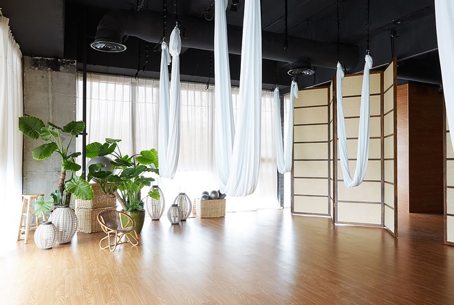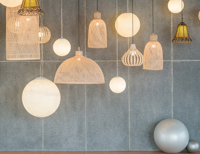 通過(guò)一個(gè)巨大的旋轉(zhuǎn)門(mén)和8米長(zhǎng)的折疊門(mén)瑜伽教室被分成了不同的區(qū)域,在私密領(lǐng)域和公共區(qū)域之間形成一個(gè)良好的平衡。走進(jìn)瑜伽教室,形態(tài)各異的燈具和編制籃刻意的懸空,連同飄蕩在空中的瑜伽帶延伸至天花板,創(chuàng)造身臨其境的視覺(jué)效果,提高練習(xí)瑜伽的體驗(yàn)。