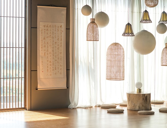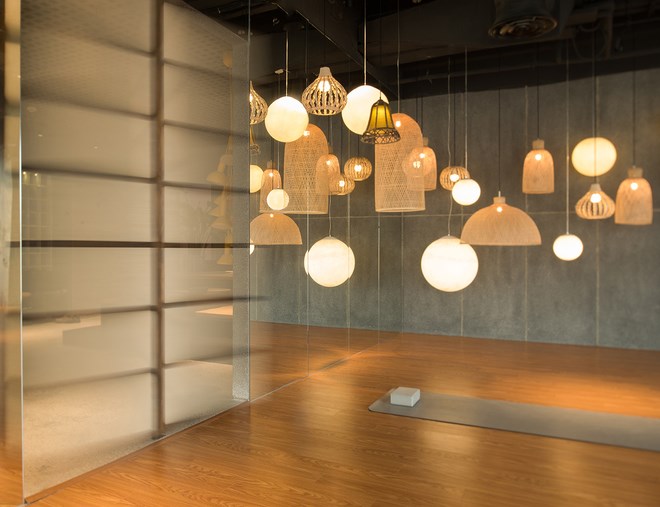 同時(shí),燈光的光線(xiàn)通過(guò)竹子互相交錯(cuò),給人一種午后的太陽(yáng)照射到身上暖洋洋的感覺(jué),心情頓時(shí)平靜下來(lái),平和的氣氛正好呼應(yīng)了瑜伽館的主旨讓身心回歸自然。