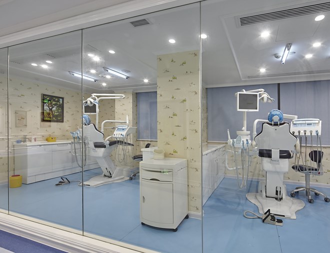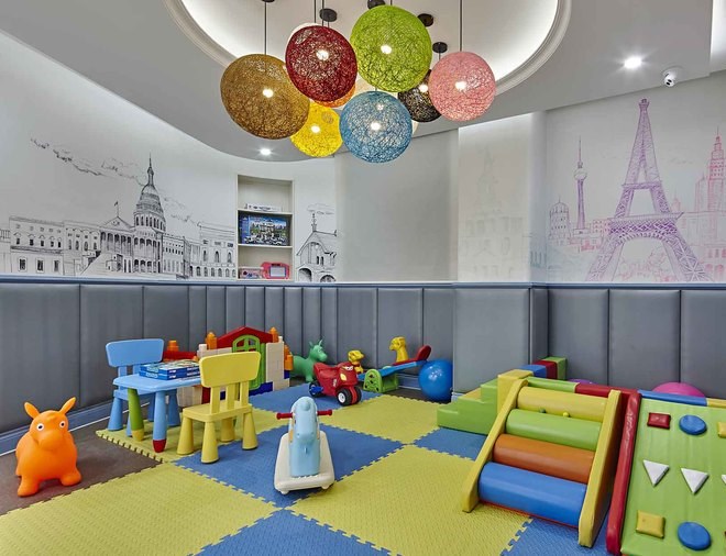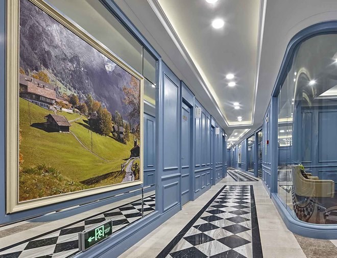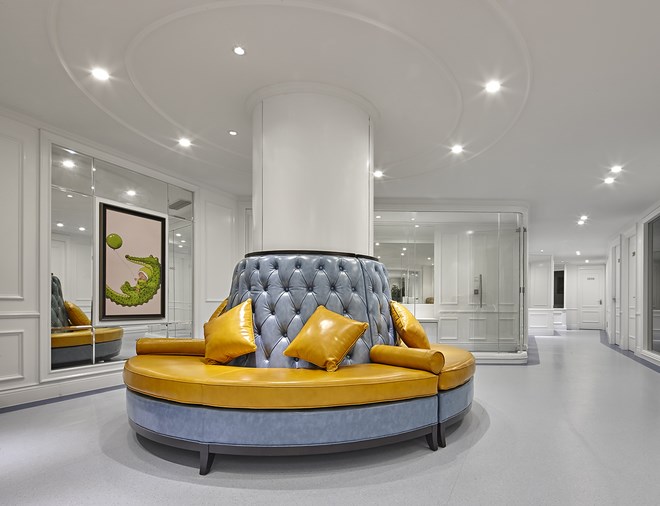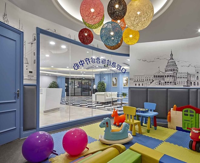 一層強(qiáng)調(diào)英倫的雅致及品位,用淺藍(lán)色歐式墻面穿插整個(gè)空間,強(qiáng)列的空間視角關(guān)系,讓客戶流連忘返,記憶深刻,達(dá)到商業(yè)醫(yī)院經(jīng)營的目的。在本層還很貼心的設(shè)立了兒童娛樂區(qū),在兒童娛樂區(qū)隨處可見的城堡元素、七彩吊燈、搖搖馬等仿佛讓兒童進(jìn)到這里就感覺身處游戲城堡之中,大大緩解了就醫(yī)前的緊張心情。