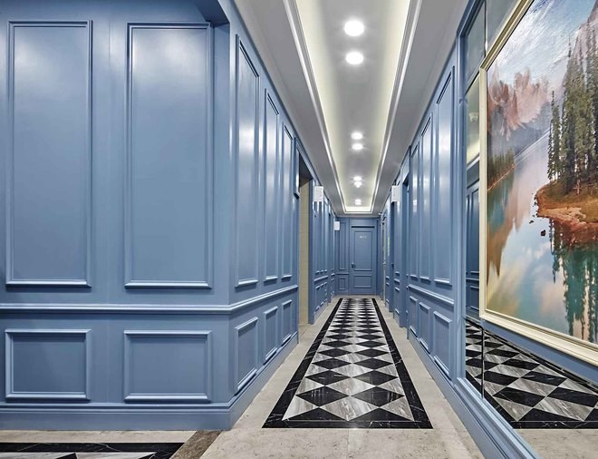 本案以“明快、藝術(shù)、英倫范”為主要設(shè)計(jì)基調(diào),通過地面黑白格子拼花、墻面裝飾線條、古典風(fēng)景油畫等點(diǎn)綴元素裝飾,空間因此具有新英倫的氣質(zhì)和藝術(shù)美感。
