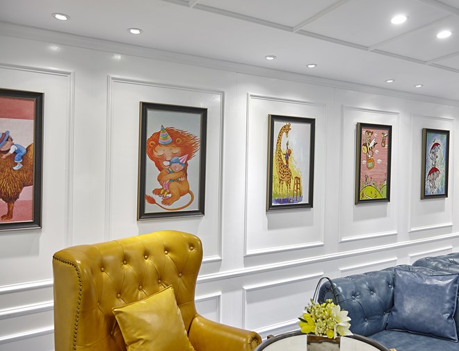 英式風(fēng)格追求精致手工藝設(shè)計(jì),講究作品的精雕細(xì)琢,照片墻、版畫、定制的口腔類雕塑等工藝品也是本案室內(nèi)設(shè)計(jì)的一大特征,藝術(shù)氣息特別濃厚。要把握英國文化元素的精髓,我們要明白一種“紳士”氣質(zhì),這用在英式風(fēng)格里絕不為過。一切都顯得那么內(nèi)斂、謙虛且不失品質(zhì)。