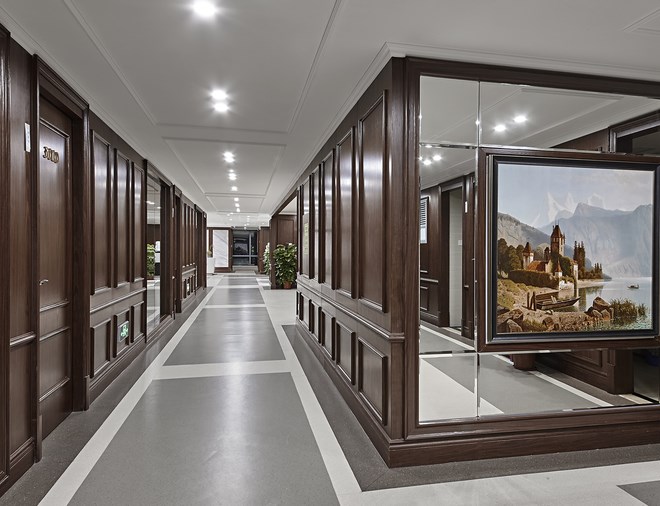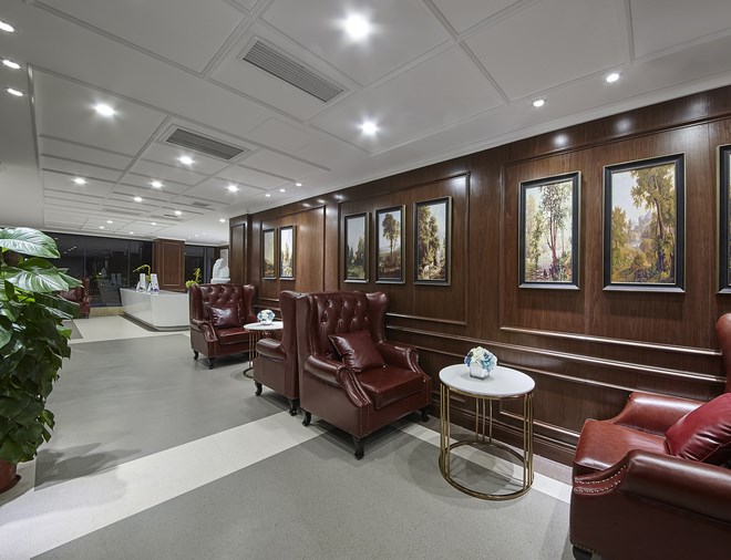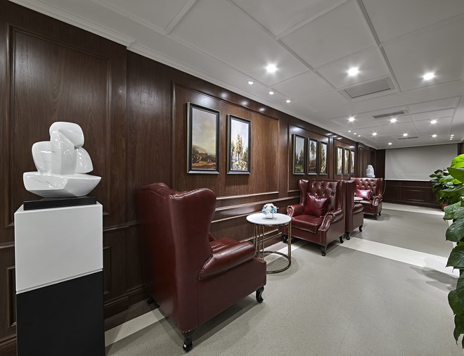 二層用整體白色木飾面墻面做設(shè)計(jì)構(gòu)思,在大面積白色調(diào)的運(yùn)用下彰顯清新格調(diào)和簡潔大方,極具醫(yī)院特色,又不缺味道與個(gè)性。曲折蜿蜒的走廊里,鏡面與油畫結(jié)合的墻面、大塊玻璃的運(yùn)用,使得原本枯燥的走廊增添一份空間感。三層VIP客戶層,強(qiáng)調(diào)私密與品位,用深色木色系墻面處理整個(gè)空間關(guān)系,與之定位相關(guān)聯(lián)。四層手術(shù)層,強(qiáng)調(diào)空間的溫馨.用暖色調(diào)的空間氛圍來削除手術(shù)功能帶來的緊張度。