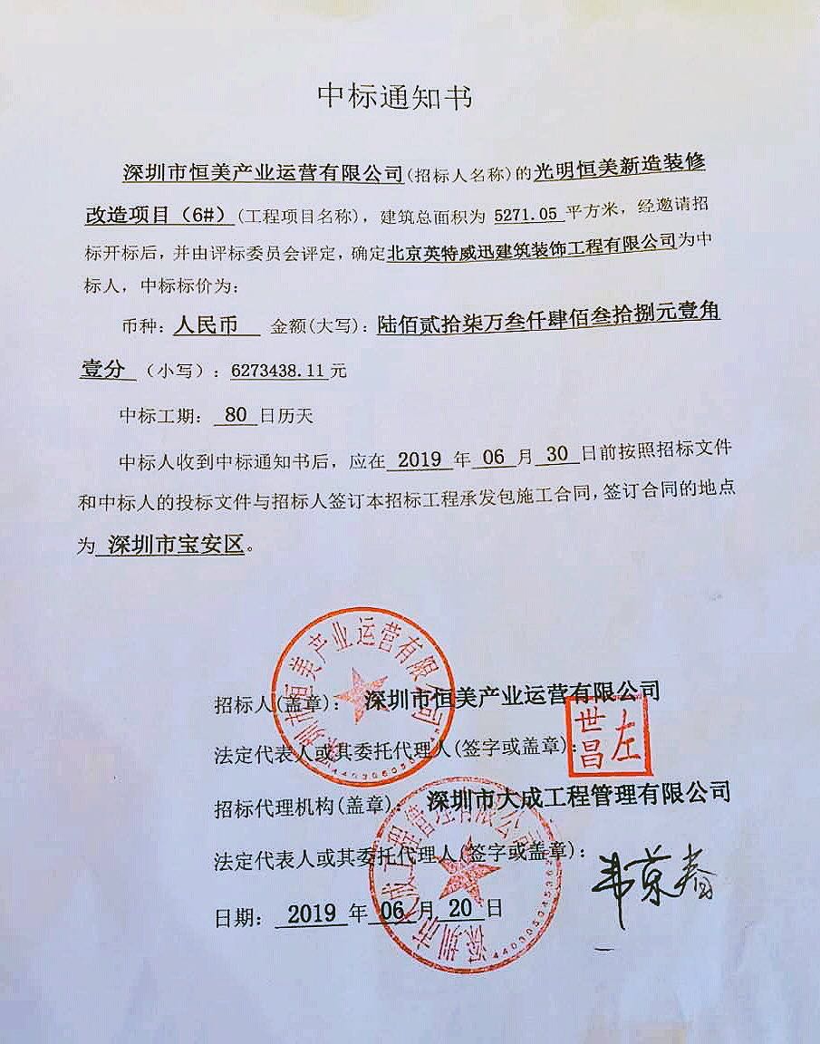 賀我公司中標(biāo)深圳恒美產(chǎn)業(yè)運(yùn)營(yíng)有限公司的光明恒美新造裝修改造項(xiàng)目,該項(xiàng)目建筑面積為5271.05㎡,經(jīng)邀請(qǐng)招標(biāo)開標(biāo)后,并由評(píng)標(biāo)委員會(huì)評(píng)定,確定北京英特威迅建筑裝飾工程有限公司為中標(biāo)人。
