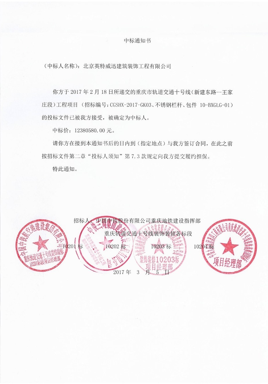 英特威迅公司成功中標(biāo)《重慶市軌道交通十號(hào)線(新建東路--王家莊段)工程項(xiàng)目集中管控物資(不銹鋼欄桿、絕緣層)項(xiàng)目》,中標(biāo)價(jià)格:12380580.00元。