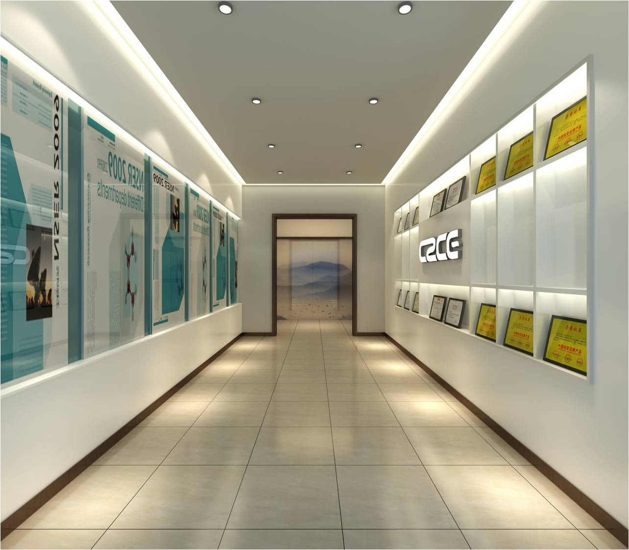 本案采用木質(zhì)的材質(zhì)與植物墻為載體體現(xiàn)公司的清潔能源的性質(zhì),木質(zhì)的天然紋理與生機(jī)勃勃的植物。入口側(cè)墻的多媒體電視滾動(dòng)播放公司的電子資料,讓訪客能盡快了解公司的狀況及未來(lái)的發(fā)展方向。白色烤漆造型與灰綠色背漆玻璃營(yíng)造的時(shí)尚簡(jiǎn)潔的公司展廳進(jìn)一步解析公司取得的成就。