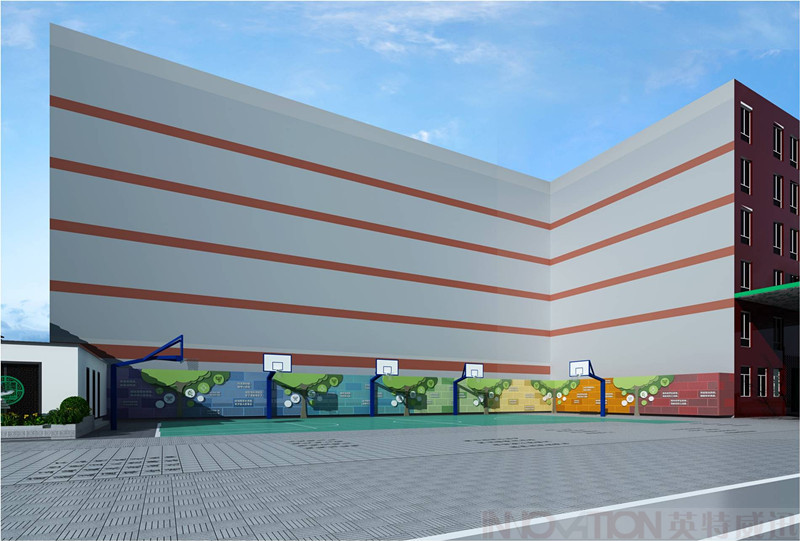 本案采用彩虹七彩顏色、寓意學(xué)生茁壯成長(zhǎng)的小樹(shù)造型與學(xué)校輔助圖形及名人名言相結(jié)合的彩虹墻設(shè)計(jì),既體現(xiàn)學(xué)校教書(shū)育人的宗旨目的,同時(shí)在學(xué)生體育活動(dòng)時(shí)不知不覺(jué)的記住箴言,整體彩虹墻采用穿孔鋼板材質(zhì),兼顧美觀及適用性、安全性,同時(shí)也不遮擋隔壁建筑的采光。