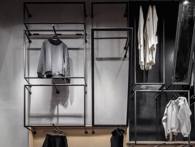 潮女區(qū)大色塊的撞色,由一根根鐵藝曲折而成的彩色貨架,在這個強(qiáng)調(diào)個性的空間,利用衣架的前后折度來分割成雙面掛衣的結(jié)構(gòu),彩色與折線的拼織來打造幻彩個性的空間已來呼應(yīng)該空間里服裝展現(xiàn)的個性。