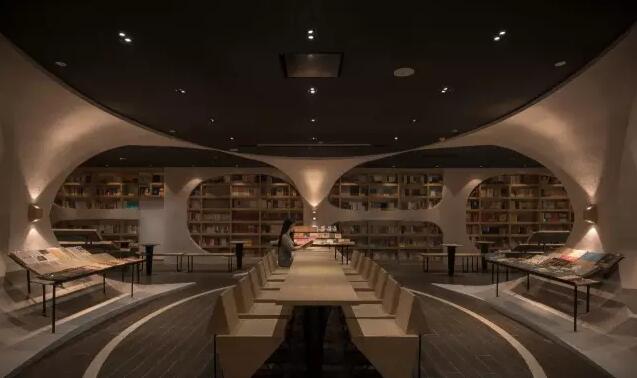 走入揚(yáng)州鐘書(shū)閣的正門(mén)則是書(shū)店的前廳通廊,設(shè)計(jì)師利用揚(yáng)州本地拱橋的概念,巧妙地延續(xù)了鐘書(shū)閣書(shū)天書(shū)地的視覺(jué)符號(hào)。在地面與天空中的河流鏗鏘前行中,引領(lǐng)著讀者沉入到浩瀚的知識(shí)海洋。兩廂的書(shū)架用優(yōu)美的弧線結(jié)構(gòu)拉伸成天際線的形狀,宛如溪流之上的橋梁,搭建著人與書(shū)籍之間的那座心靈橋梁。進(jìn)而前行至右側(cè)則是更加廣闊的書(shū)籍之地,拱橋及河流的關(guān)系給了設(shè)計(jì)師無(wú)窮的靈感,于是得到此處的上下鏡像的空間關(guān)系。設(shè)計(jì)師還利用各種拱形來(lái)連接各個(gè)區(qū)域,每一位讀者進(jìn)入這個(gè)空間,就能充分感受到這空間帶來(lái)的震撼。鏡像、拱形加上柔和的燈光,這一切所帶來(lái)的迷離感,會(huì)讓讀者不由自主地想起橋下的波光粼粼,悄然靜思中達(dá)到心情的平和,并享受讀書(shū)的快樂(lè)。由各種波起伏連接而成的空間,保留了足夠的尺度,以便留給給讀書(shū)分享會(huì)的讀者分享的場(chǎng)地。