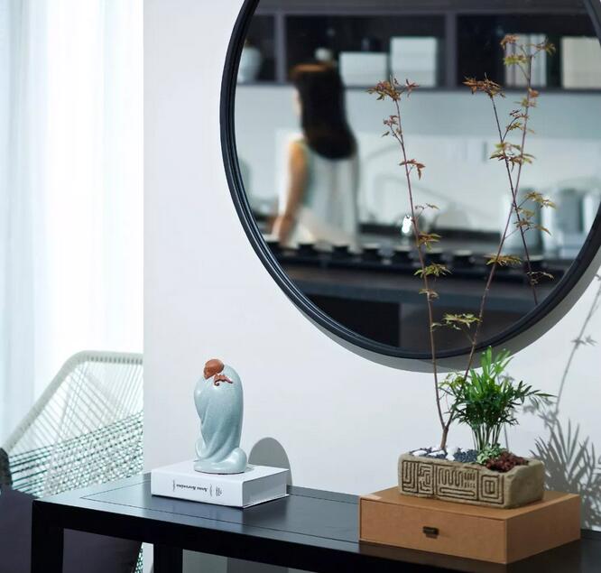 透過(guò)入口玻璃窺探,一幅太湖石畫(huà)映入眼簾,千古名石肌理由蒙古黑燒制而成,引園林意境入室。達(dá)摩的雕塑隱喻了當(dāng)下語(yǔ)境中禪意美學(xué)的回歸。