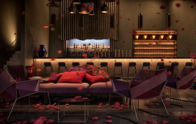 薰衣草色、粉紅和紅色的陰影正好和地板的炭灰色形成了平衡。吧臺旁邊有一排藍(lán)色的腳凳,只有一個(gè)藍(lán)色的花瓶帶來另外一種顏色,形成中立的裝飾。
