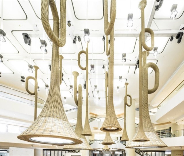 “this is OUR place”以懸掛在中庭天花板上的成對(duì)的大型音樂(lè)號(hào)角為特征,懸在空中的樂(lè)器是由柳條編織而成,與青銅金屬表面形成溫暖的氣氛。裝上多媒體之后,人們還能沉浸在3個(gè)大號(hào)角的360°全景下。