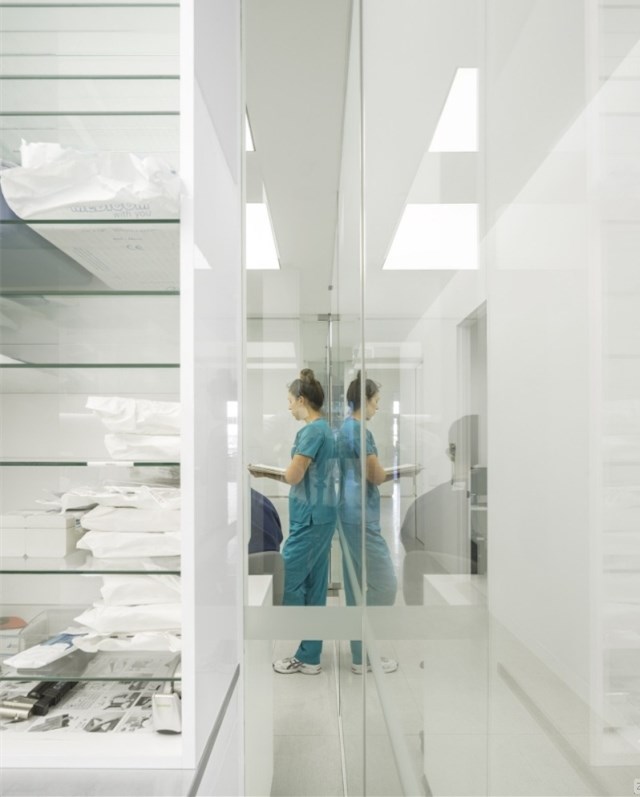 診所里其他的區(qū)域都圍繞著中間那條走道排列,這條走道從接待區(qū)那里出發(fā),將整個(gè)診所的所有區(qū)域都串在了一起,從檢查區(qū),手術(shù)區(qū),到客戶區(qū)和技術(shù)區(qū)。走道的中間是一個(gè)玻璃做成的透明區(qū)域,這是為了讓外面的光線穿透進(jìn)室內(nèi)來。